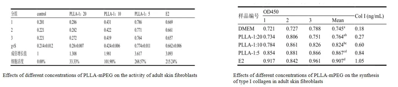 ZQ-II PLLA పోషకాల ప్రభావాన్ని గమనించడానికికొల్లాజెన్ పునరుత్పత్తి, యొక్క కార్యాచరణపై PLLA-MPEG యొక్క వివిధ సాంద్రతలువయోజన చర్మం ఫైబ్రోబ్లాస్ట్లు మరియు టైప్ I కొల్లాజెన్ యొక్క సంశ్లేషణMTT మరియు ELISA చేత కనుగొనబడ్డాయి. PLLA-MPEG తో చికిత్స పొందిన తరువాత, కణాల సంఖ్య గణనీయంగా పెరుగుతుంది మరియు ఒక నిర్దిష్ట పరిధిలో PLLA-MPEG పెరుగుదలతో పెరుగుతుంది, PLLA-MPEG వయోజన స్కిన్ ఫైబ్రోజెనిసిస్ సెల్ విస్తరణను గణనీయంగా ప్రోత్సహిస్తుందని సూచిస్తుంది, వయోజన స్కిన్ ఫైబ్రోబ్లాస్ట్లలో టైప్ I కొల్లాజెన్ యొక్క స్రావాన్ని ప్రోత్సహిస్తుంది.